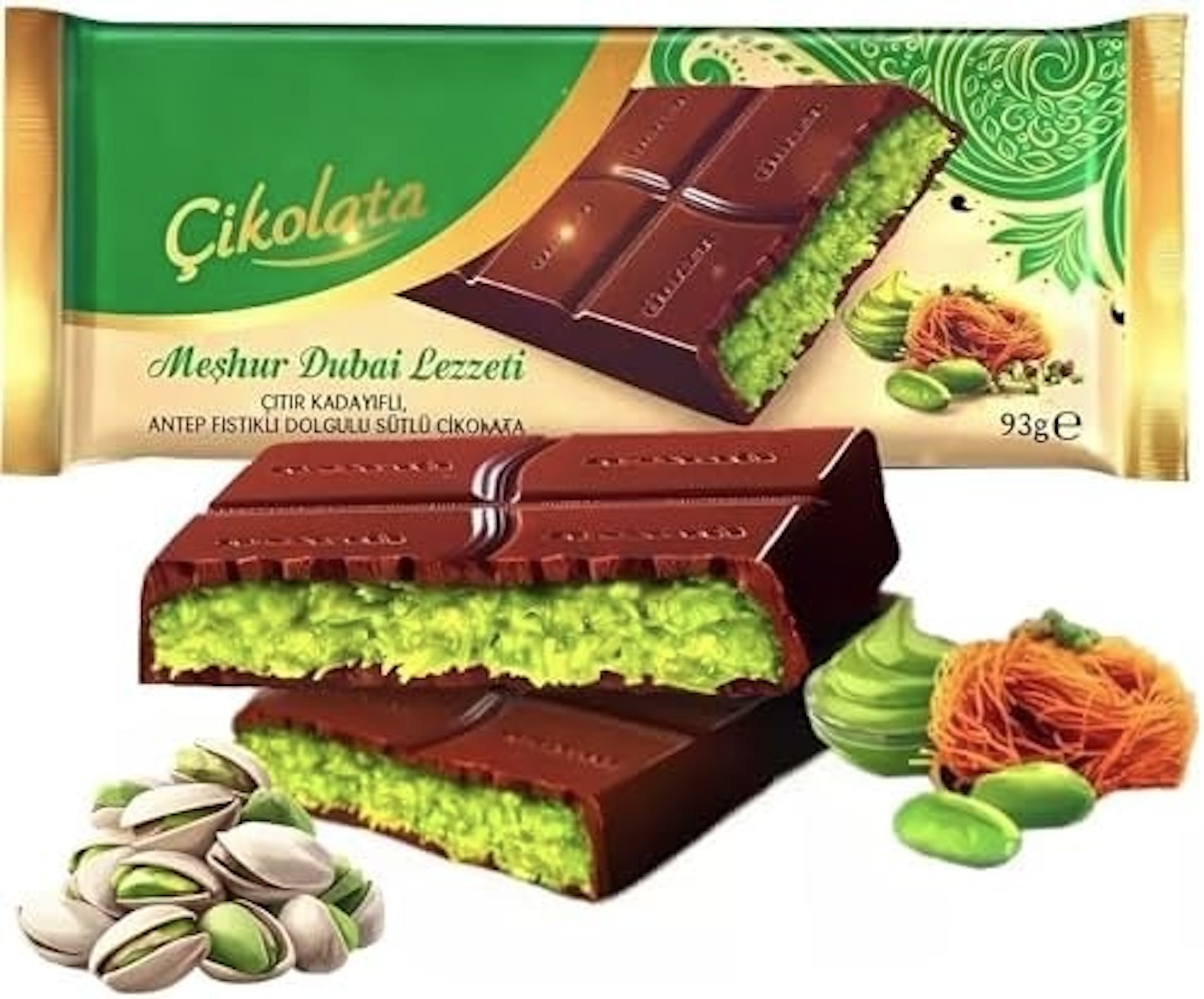 Ülker Meshu Dubai Lezzeti is not just a viral chocolate, but also a cultural experience that represents the richness and diversity of Dubai's flavors. Enjoy the luxurious taste of pistachios and crunchy pieces of kadayif.